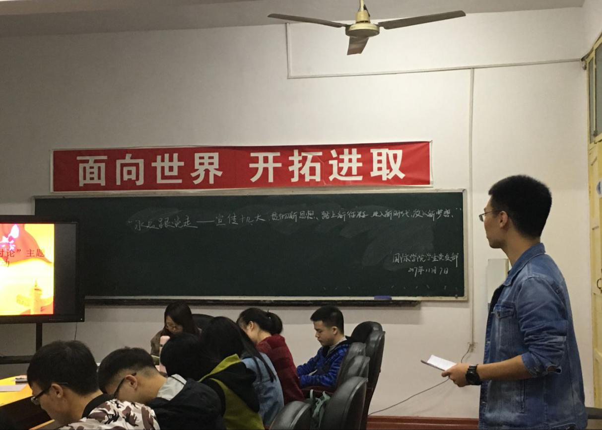 为深入学习十九大报告精神,激发学生党支部党员爱党爱国的热情,11月7日晚7点30,国际学院学生党支部召开支部党员会议,集中学习讨论十九大的报告。会议主题为“永远跟党走——宣传十九大,贯彻新思想,踏上新征程,进入新时代,放飞新梦想”,由学生党支部书记胡慧主持会议。