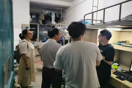 2021年6月10号晚八点,国际学院党总支部书记刘期忠老师、副书记李佑丰老师、辅导员刘宏老师和毕业班班主任刘英老师、王曦老师和学生会干部一道对2017级的同学们进行了寝室检查。