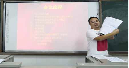 “继往开来, 扬帆起航” ——国际学院团学第二届双代会笫二次会议于9 月 25日晚上7点在南栋108教室成功举行,国际学院党总支书记刘期忠同志、团总支书记杨爱玲老师以及学生会助理刘宏老师代表出席了此次大会。圆满完成了大会的各项议程。