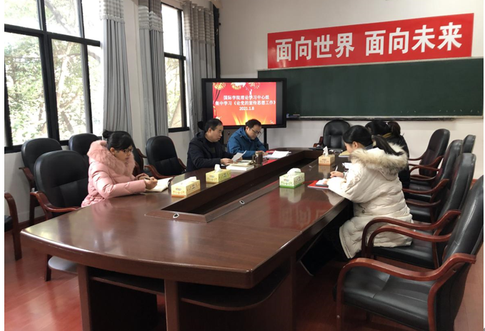 2021年1月8日上午10点,国际学院理论学习中心组在崇德楼会议室召开集中学习会议,结合深入贯彻党的十九届五中全会精神,专题学习《论党的宣传思想工作》,党总支书记刘期忠主持会议。