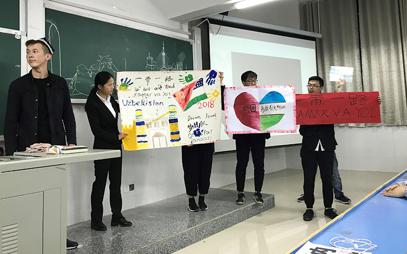 “Dream team”团队正在展示来自乌兹别克斯坦的留学生写的书法作品