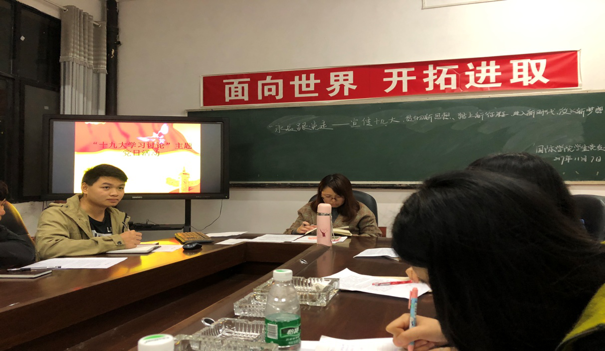 为深入学习十九大报告精神,激发学生党支部党员爱党爱国的热情,11月7日晚7点30,国际学院学生党支部召开支部党员会议,集中学习讨论十九大的报告。会议主题为“永远跟党走——宣传十九大,贯彻新思想,踏上新征程,进入新时代,放飞新梦想”,由学生党支部书记胡慧主持会议。