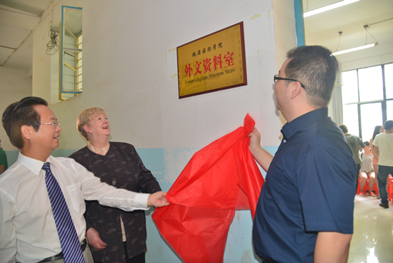 桑德拉.何丽斯女士与曹建华校长共同为魏源国际学院的外文书籍阅览室举行揭牌。