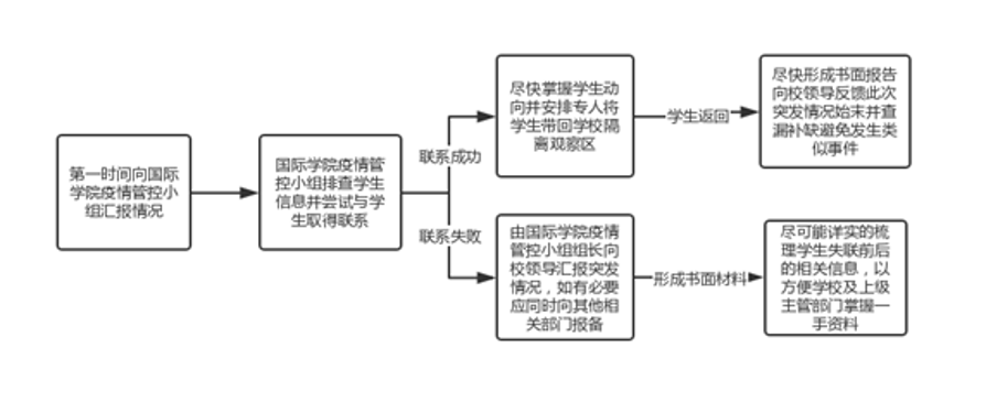 3.与后勤服务中心保持密切联系,确保留校国际学生宿舍水电供应正常,避免因低温导致的感冒等不必要情况出现;如发现学生异常情况,及时上报疫情。