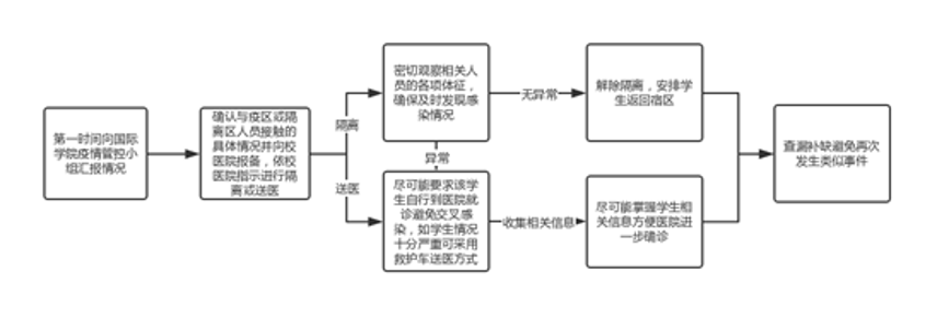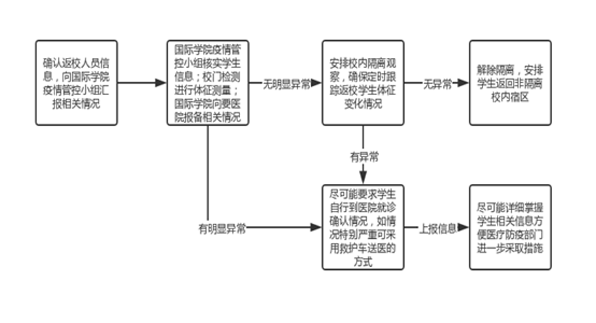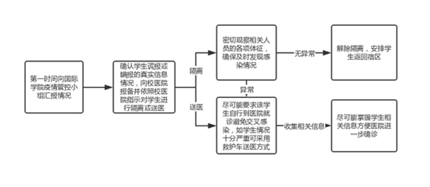 处理此类突发情况时,须首先确认学生生理体征状况,如发现体征异常,须要求学生到医院确认是否感染病毒,对于无明显体征异常的学生,应按相关规定及时安排隔离观察。