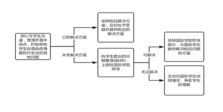 为落实学校疫情防控工作要求,可能会衍生出一些国际学生无法理解的情况,进而导致纠纷。如国际学生出于对疫情的恐慌心理,可能放弃继续留学计划,但因无法返校办理退学手续并办理退费手续,或因退费周期较长,从而产生不满情绪等。处理此类问题时应尽可能理解学生心理,积极响应,热情服务,及时回复,以树立学校良好口碑为处理此类突发事件的宗旨。