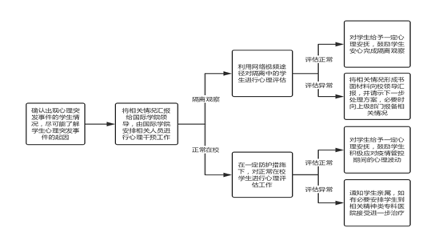 国际学生普遍对疫情存在恐慌心理,因此在疫情防控期间学生很可能出现各种心理突发状况,此类事件属易发生的疫情间接类突发事件。在处理此类事件过程中,按照《国际学院关于切实做好新型冠状病毒感染的肺炎疫情紧急心理危机干预方案》办理。相关工作人员应及时向学院防控工作领导小组汇报进展情况,必要时还要向学校汇报。