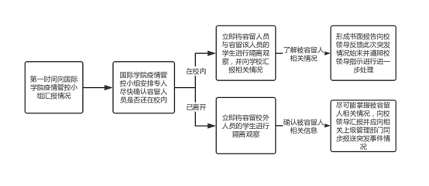 处理此类突发事件时,须第一时间掌握被容留人的相关信息,尤其是被容留人员是否去过武汉或者是否与去武汉来人接触过。在与学生及被容留人沟通时要注意自身防护,以避免交叉感染。